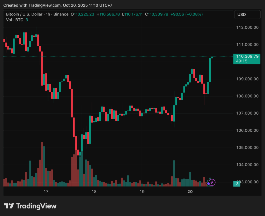 จากข้อมูลกราฟ BTC/ USDT บน Binance เผยให้เห็นว่าในช่วงเวลาประมาณ 10.55 น. ของวันนี้ (20 ตุลาคม) ราคา Bitcoin พุ่งขึ้นแตะ $110,420 ซึ่งเป็นการกลับมายืนเหนือ $110,000 อีกครั้ง หลังจากที่นักลงทุนและเทรดเดอร์คาดการณ์ถึงการฟื้นตัวอย่างรวดเร็วของตลาด