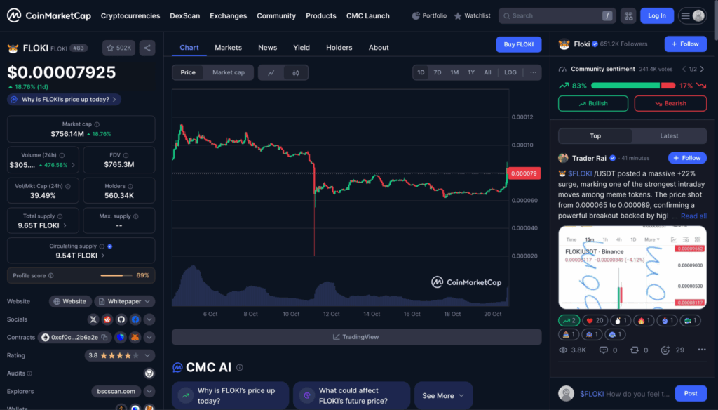 • ราคาพุ่งแรง: $FLOKI มีราคาพุ่งขึ้นอย่างรุนแรงถึง 19.00% (สมมติตัวเลข) ภายใน 24 ชั่วโมงที่ผ่านมา โดยมีมูลค่าตลาด (Market Cap) อยู่ที่ $771.02 ล้านดอลลาร์