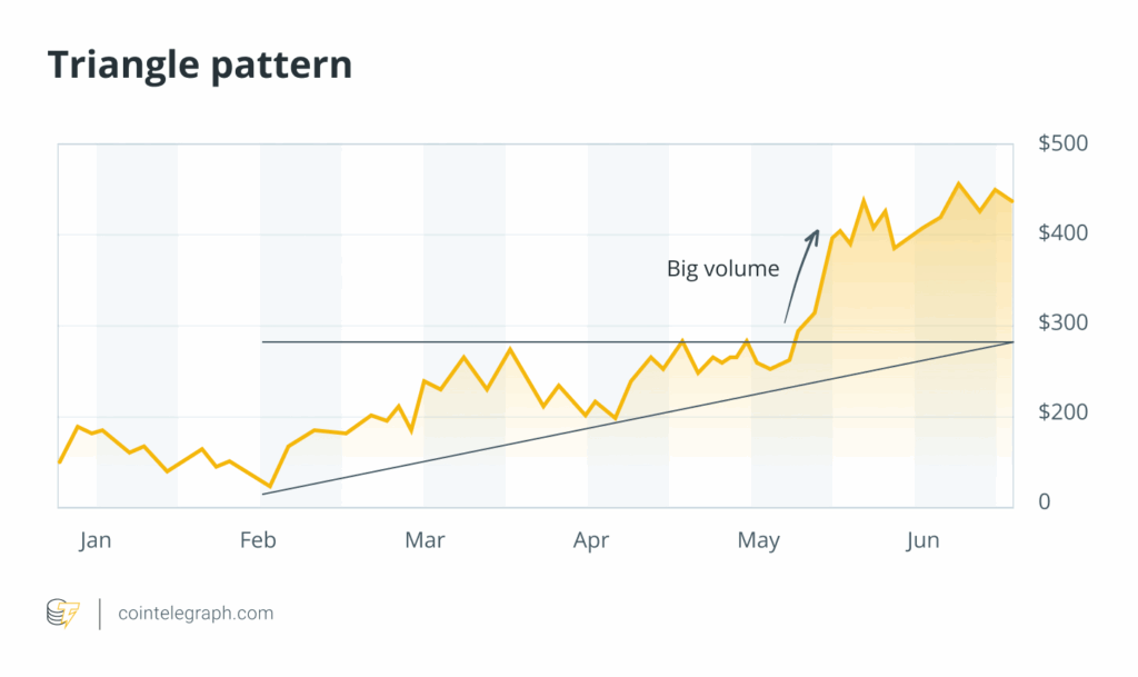 ต่อกันด้วยรูปแบบสามเหลี่ยมที่จะก่อตัวขึ้นเมื่อการเคลื่อนไหวของราคาสร้าง เส้นแนวโน้มที่บรรจบกัน (converging trendlines) ทำให้เกิดรูปทรงสามเหลี่ยม และมักปรากฏในช่วงที่ตลาดยังคงลังเลไม่สามารถเลือกทิศทางได้