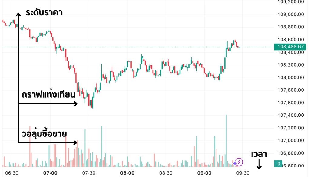 X-axis : กรอบระยะเวลา ในเส้นแนวนอนด้านล่างคือช่วงระยะเวลาของกราฟที่เราจะดู ซึ่งสามารถดูได้ตั้งแต่ 1 วินาที (สำหรับเทรดสั้น) ไปจนถึงกราฟหลักปี (สำหรับดูภาพใหญ่)