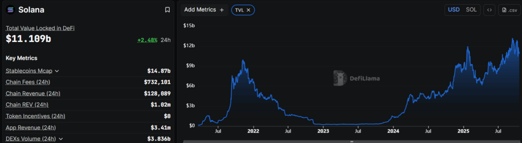 นอกจากนี้ Solana ยังเริ่มมีบทบาทมากขึ้นในหลายอุตสาหกรรม เช่น การชำระเงิน (Payments), เกม (Gaming) และ แอปผู้บริโภค (Consumer Apps) และปัจจุบันยังเป็นระบบ DeFi ใหญ่เป็นอันดับ 2 ของโลก ด้วยมูลค่า Total Value Locked (TVL) กว่า 11,000 ล้านดอลลาร์