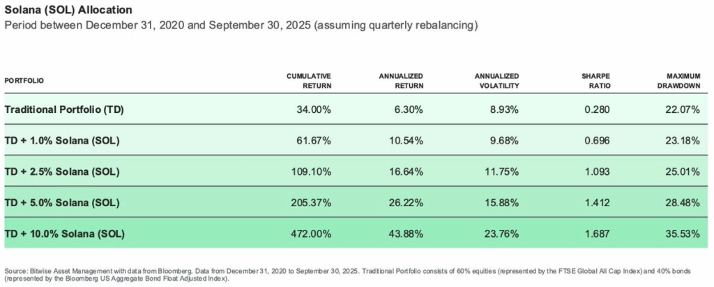 งานวิจัยนี้เป็นผลการวิจัยโดย Capital Markets ซึ่งอ้างอิงข้อมูลจาก Bitwise ได้ทำการทดสอบการเพิ่ม Solana เข้าไปในพอร์ตมาตรฐานแบบ 60/40 (หุ้น 60% พันธบัตร 40%) พบว่า แค่ถือ SOL เพียง 1% ของพอร์ต ก็ช่วยเพิ่มผลตอบแทนเฉลี่ยต่อปีขึ้นเป็น 10.54% พร้อมกับเพิ่ม Sharpe Ratio (ตัวชี้วัดผลตอบแทนต่อความเสี่ยง) เป็น 0.696