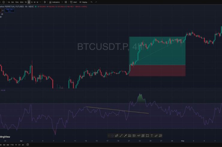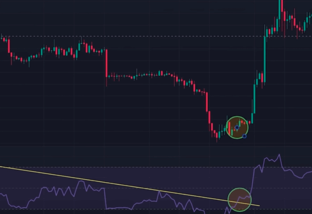 นี่คือจุดสำคัญที่สุด เมื่อไหร่ที่ RSI วิ่งขึ้นมาทะลุเส้นเทรนด์ไลน์ที่เราลากไว้ นั่นคือสัญญาณว่าการพักตัวจบแล้ว ราคากำลังจะกลับมาขึ้นต่อ นี่คือจังหวะที่เราควรเข้าซื้อ