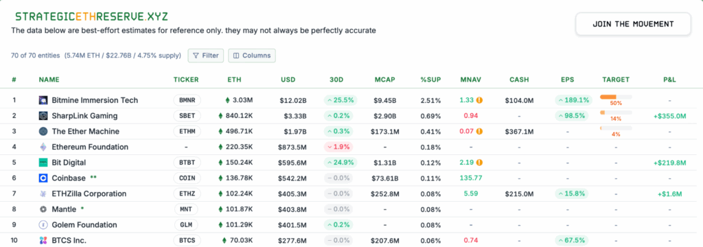 ข้อมูลจาก Strategicethreserve.xyz ยืนยันว่า ปัจจุบันมีบริษัทที่ถือครองคลังสินทรัพย์ Ethereum รวมกันถึง 69 แห่ง ด้วยจำนวน ETH รวม 5.74 ล้านเหรียญ แนวโน้มนี้เป็นเครื่องยืนยันว่านักลงทุนสถาบันมองว่า ETH คือโครงสร้างพื้นฐานหลักที่มีประสิทธิภาพในการสร้างผลตอบแทน และสร้างความมั่นคงทางการเงินในระยะยาว