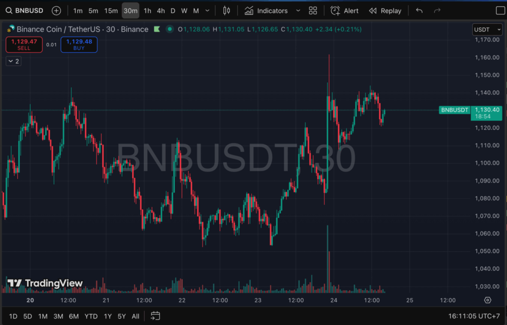ในขณะที่รายงาน ราคา BNB มีการปรับตัวลงเล็กน้อย มีการซื้อขายกันอยู่ $1,130 ซึ่งอยู่ห่างจากจุดสูงสุดตลอดกาล (ATH) ที่ $1,375 ประมาณ 18%
