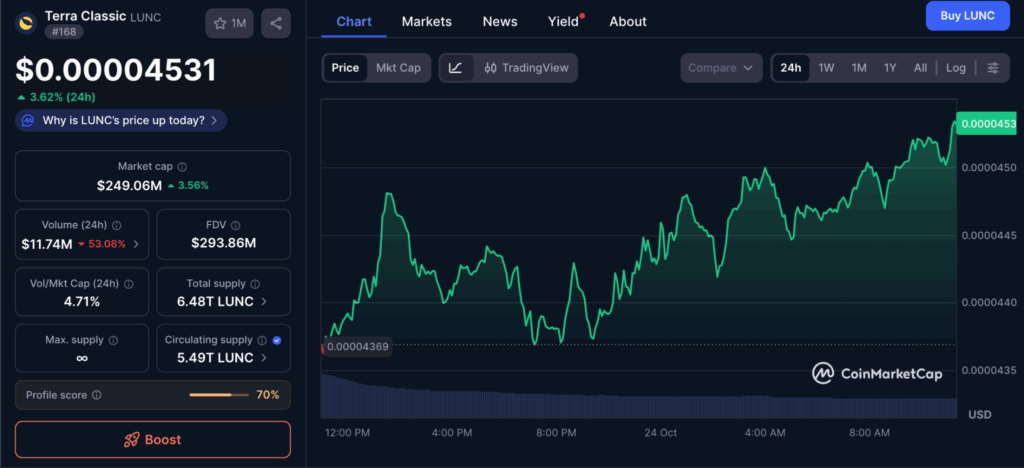 ในขณะที่รายงาน ราคา LUNC กำลังซื้อขายอยู่ที่ 0.00004531 ดอลลาร์ เพิ่มขึ้น 3.62% ภายใน 24 ชั่วโมง อ้างอิงข้อมูลจาก coinmarketcap