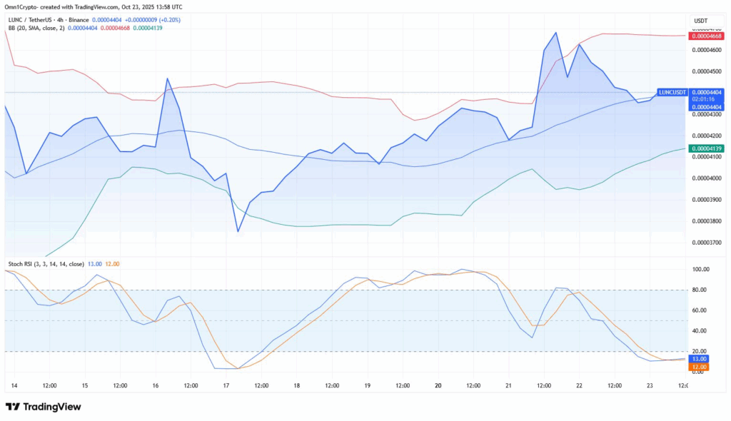 หลังจากที่ราคาปรับตัวลงอย่างหนัก ท่ามกลางกระแสความขัดแย้งทางภูมิรัฐศาสตร์และการล้างพอร์ตมูลค่า 1.9 หมื่นล้านดอลลาร์ในตลาดคริปโต ล่าสุด LUNC ก็เริ่ม ทรงตัวที่ประมาณ $0.000044 โดยมีสัญญาณบวกจาก MACD และค่า RSI ที่อยู่ในโซน ‘ขายมากเกินไป’ (oversold) ซึ่งเป็นสัญญาณที่มักบ่งชี้ว่า ราคากำลังจะฟื้นตัวในไม่ช้า
