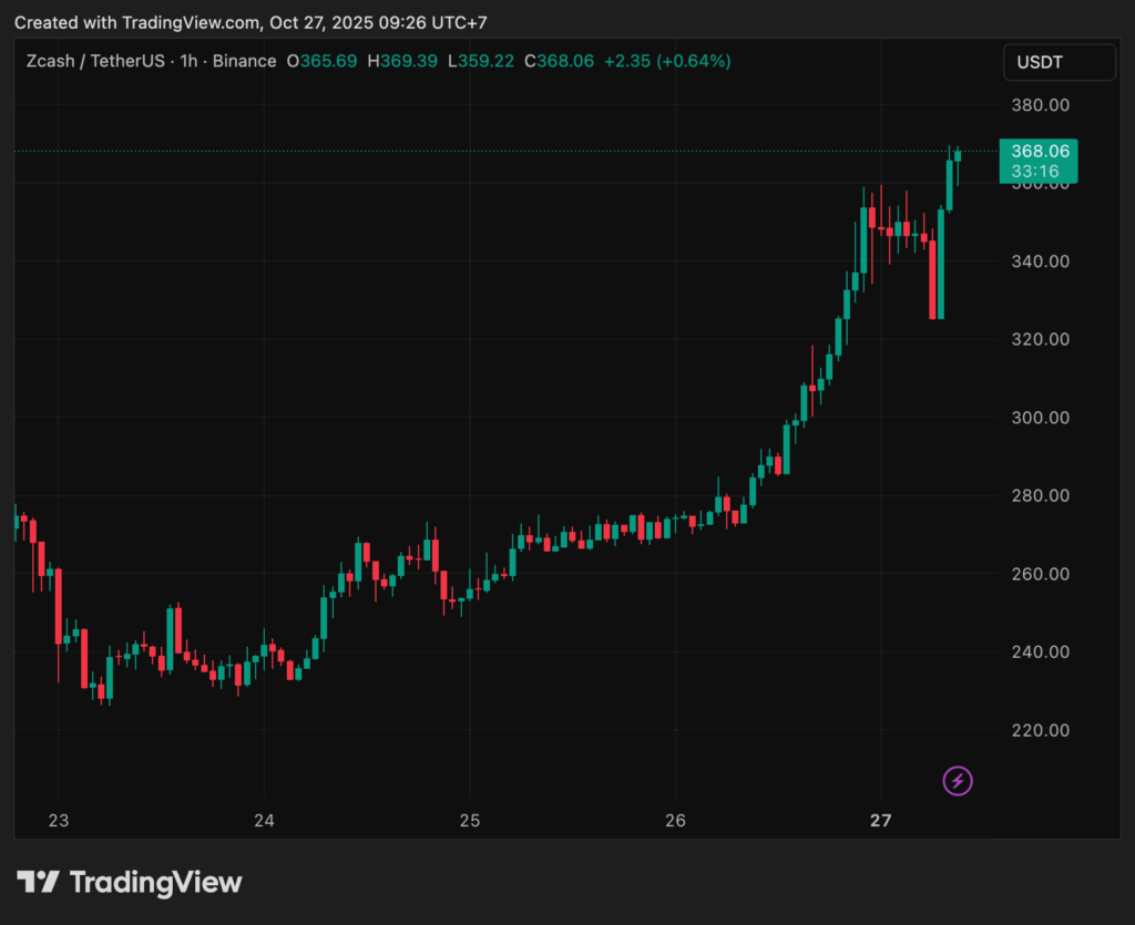 ราคาของเหรียญ Zcash (ZEC) ได้สร้างความตกตะลึงให้กับนักลงทุนทั้งตลาด โดยในช่วง 24 ชั่วโมงที่ผ่านมา ราคาเหรียญพุ่งได้ทะยานขึ้นกว่า 30% จาก $273 ขึ้นมาสู่ $362 เป็นการขยับเข้าใกล้สถิติสูงสุดของปีนี้ที่ $370 อย่างรวดเร็ว