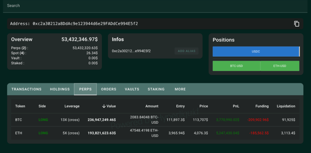 สำหรับโพสิชั่นปัจจุบัน เจ้ามือรายนี้ยังคงถือ โพสิชั่น Long Bitcoin ด้วยเลเวอเรจ 13x มูลค่า $230 ล้านดอลลาร์ โดยมีจุดเข้าที่ราคา $111,897 และมีกำไรลอยตัว (Unrealized Profit) อยู่ที่ประมาณ $3.7 ล้านดอลลาร์
