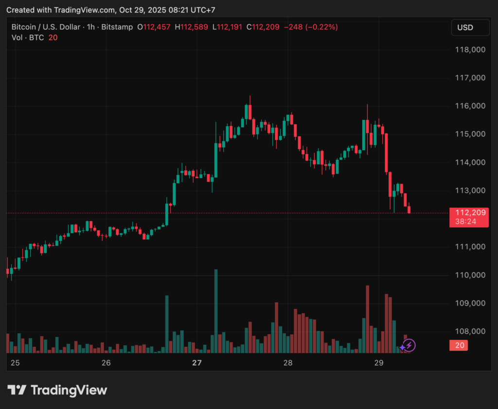 อ้างอิงข้อมูลจากกราฟ BTC/USD ตลอดช่วงค่ำคืนที่ผ่านมาราคา Bitcoin ได้ร่วงอย่างต่อเนื่องจากจุดสูงสุดระหว่างวันที่ $116,000 ลงมาทำจุดต่ำสุดระหว่างวันที่ $112,100 หรือคิดเป็นการร่วงลงมากกว่า -3.2% ซึ่งเป็นปฏิกิริยาของตลาดที่เข้าสู่โหมด “ระมัดระวัง” ก่อนเหตุการณ์สำคัญในคืนนี้