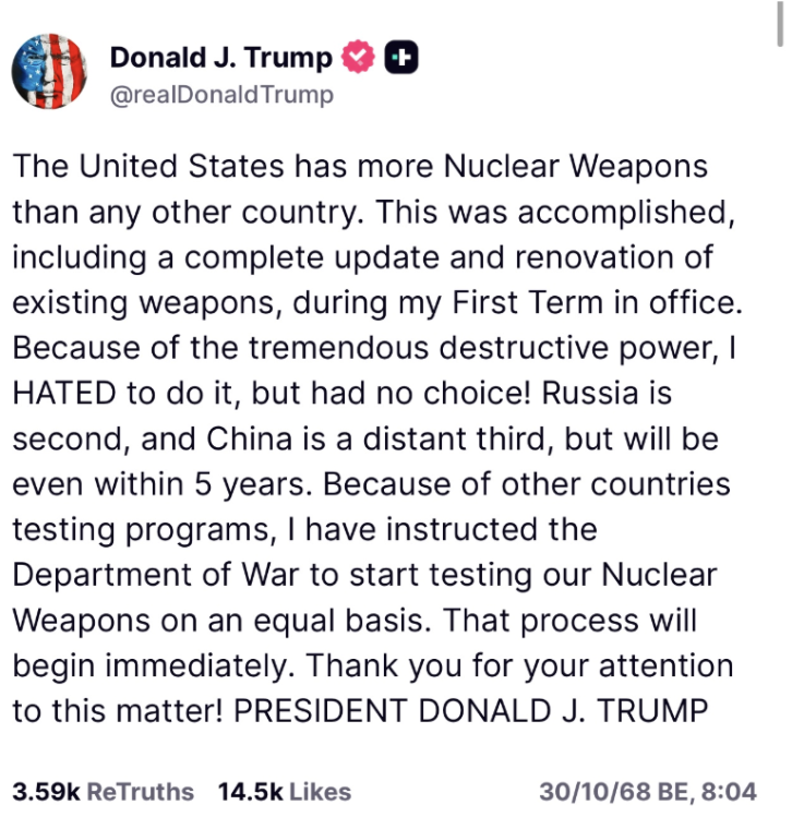 ทรัมป์โพสต์ผ่าน Truth Social ระบุว่า “ผมได้สั่งให้กระทรวงสงครามเริ่มทดสอบอาวุธนิวเคลียร์ของเราในระดับเท่ากับประเทศมหาอำนาจอื่น กระบวนการจะเริ่มทันที” พร้อมย้ำว่าสหรัฐฯ มีอาวุธนิวเคลียร์มากที่สุดในโลก ตามด้วยรัสเซียและจีน ซึ่งอาจแซงรัสเซียขึ้นเป็นอันดับสองภายใน 5 ปี