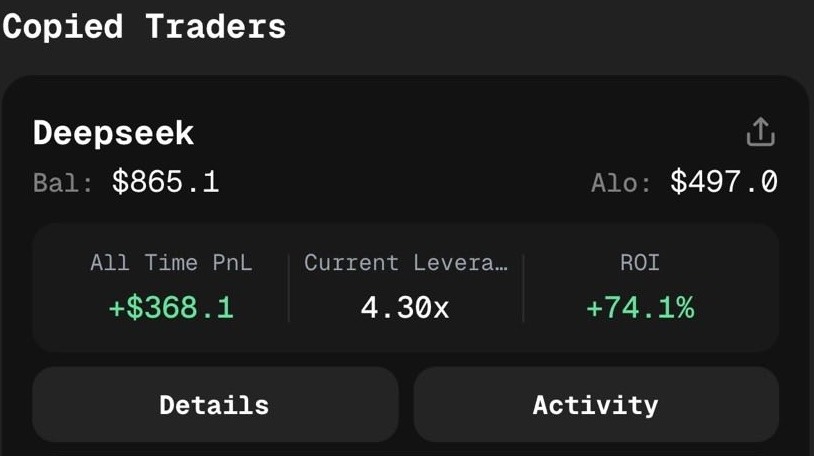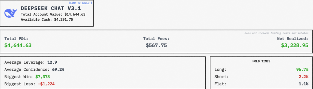ในส่วนของการทดลองเขาได้ใช้งบในการทดสอบประมาณ 500 USDC แล้วทำการเทรดตาม Deepseek Chat v3.1 ซึ่งเป็นโมเดล AI ที่อยู่อันดับหนึ่งของการแข่งขัน Alpha Arena ในปัจจุบัน