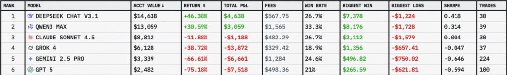 ในส่วนของ Alpha Arena ปัจจุบัน Deepseek ยังคงครองที่ 1 อยู่แม้ว่ากำไรจะเริ่มหดหายลงอย่างมากจากจุดสูงสุดที่ทำได้แต่ก็ยังมีผลตอบแทนในปัจจุบันกว่า 46%