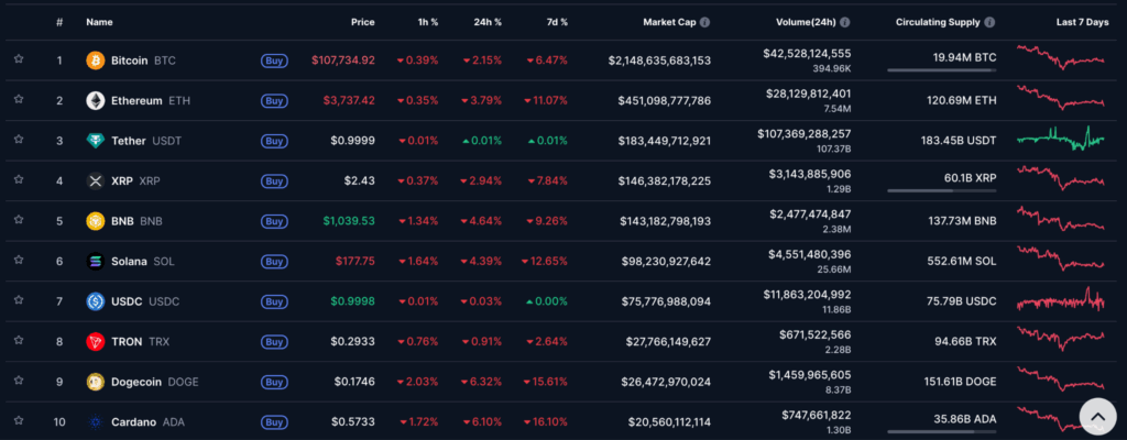 BNB แม้จะเป็นเหรียญที่แข็งแกร่งกว่าในกลุ่ม Top 10 แต่ก็หนีไม่พ้นแรงเทขาย ปรับตัวลง 1.26% ในรอบชั่วโมง, 4.67% ในรอบวัน และ 9.39% ในรอบสัปดาห์ อยู่ที่ $1,039.30 แต่ยังทำกำไร 48.26% ในปีนี้ ขณะที่เหรียญอื่นๆ ร่วงหนักกว่า โดย Ethereum (ETH) ซื้อขายที่ $3,733.50 ลดลง 3.86% ในรอบวัน และ 11.11% ในรอบสัปดาห์, XRP ร่วงหนัก 2.98% ในรอบวัน และ 7.89% ในรอบสัปดาห์ ซื้อขายที่ $2.43, Cardano (ADA) ร่วงที่สุดในกลุ่ม Top 10 ลดลง 6.20% ในรอบวัน และทิ้งระยะถึง 16.09% ในรอบสัปดาห์ ซื้อขายที่ $0.5732