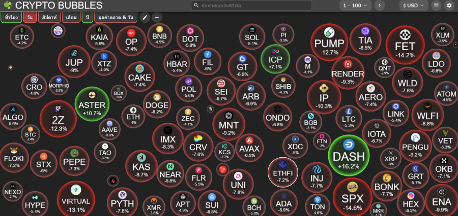 กลุ่ม Altcoin ได้รับผลกระทบหนักกว่า โดย Solana (SOL) ร่วงหนักที่สุดในกลุ่มเหรียญชั้นนำ ปรับตัวลง 1.38% ในรอบชั่วโมง, 4.48% ในรอบวัน และทิ้งระยะ 12.62% ในรอบสัปดาห์ ปัจจุบันซื้อขายที่ราคา $177.89 แม้จะมีความหวังจาก AI ของ Alibaba ที่คาดการณ์ว่าหาก SOL ได้รับอนุมัติ ETF ราคาอาจพุ่งถึง $700 ส่วน Dogecoin (DOGE) ร่วงหนักที่สุดในกลุ่มเมมคอยน์ ลดลง 1.48% ในรอบชั่วโมง, 6.31% ในรอบวัน และ 15.48% ในรอบสัปดาห์ ซื้อขายที่ $0.1748 ซึ่งยังไม่ฟื้นตัวเต็มที่จากช่วง Flash Crash ที่เคยดิ่งไป 50% ชั่วคราว