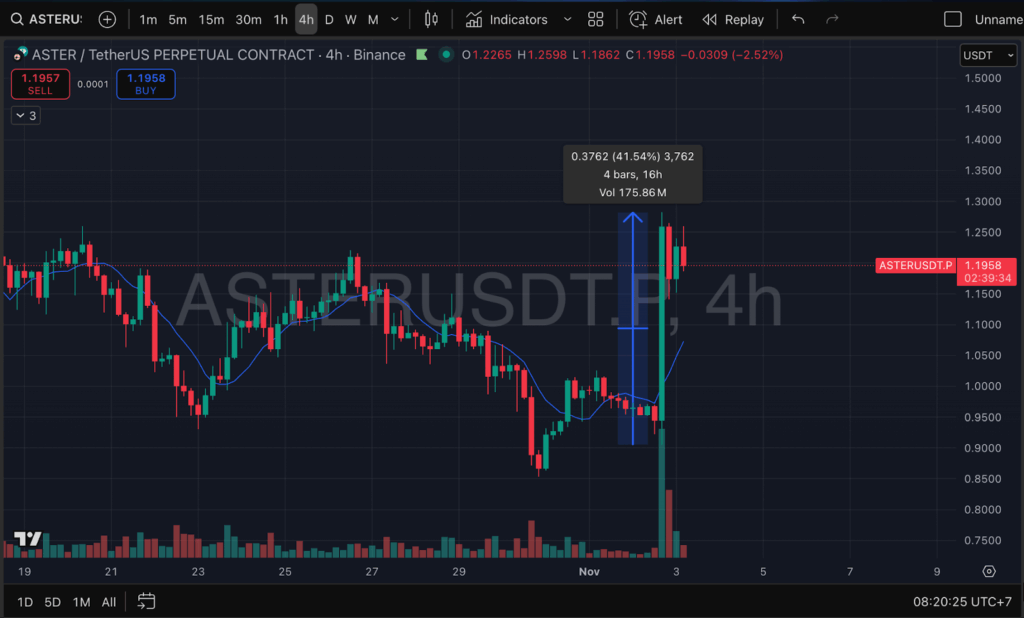 จากนั้นภายในเวลาไม่ถึงหนึ่งชั่วโมง ราคา Aster ก็ปรับตัวขึ้นจาก $0.91 ขึ้นไปสูงสุดแถว $1.30 คิดเป็นการเพิ่มขึ้นกว่า 40%