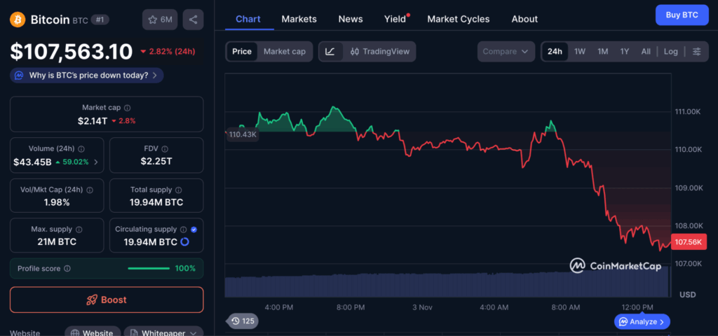 ในขณะที่รายงาน ราคา Bitcoin กำลังซื้อขายอยู่ที่ 107,563 ดอลลาร์ ลดลง 2.82% ภายใน 24 ชั่วโมง อ้างอิงข้อมูลจาก coinmarketcap
