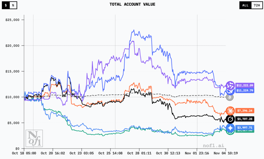 การแข่งขันเป็นไปอย่างสูสีจนกระทั่งวินาทีสุดท้าย โดย QWEN ปิดท้ายด้วยพอร์ต $12,000 ในขณะที่ DeepSeek อยู่ที่ $11,200 ซึ่งแม้จะดูใกล้เคียงกันในตอนจบ แต่ทั้งสองโมเดลเคยพุ่งทะยานไปสัมผัส $20,000+ ก่อนที่ความผันผวนของตลาดคริปโตจะดึงพวกมันลงมาใกล้จุดคุ้มทุนในช่วงโค้งสุดท้าย