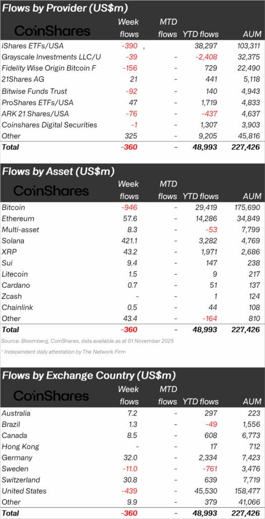 กองทุนผลิตภัณฑ์การลงทุนในสินทรัพย์ดิจิทัลเผชิญกับภาวะเงินทุนไหลออกครั้งใหญ่ที่สุดในรอบกว่าสองเดือน โดยข้อมูลล่าสุดจากรายงานของ CoinShares เมื่อวันที่ 3 พฤศจิกายน ระบุว่า มีเงินทุนไหลออกสุทธิรวม 360 ล้านดอลลาร์ในสัปดาห์ที่แล้ว