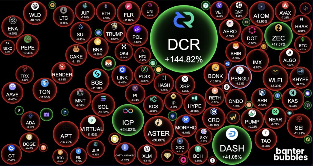 อย่างไรก็ตาม ข้อมูลจาก Banter Bubble เผยให้เห็นว่า ท่ามกลางการเทขายของตลาด Altcoin เกือบทั้งหมด มีเพียงเหรียญกลุ่ม Privacy Coin เท่านั้น เช่น DCR, DASH, และ ZCASH ที่ยังคงยืนหยัดต้านทานสภาวะตลาดขาลงนี้ไว้ได้