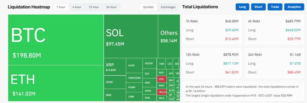 ในช่วง 24 ชั่วโมงที่ผ่านมา ตลาดต้องเผชิญกับยอดการล้างพอร์ตฝั่ง Long ที่สูงลิ่วถึง $303 ล้านดอลลาร์ และเมื่อรวมมูลค่าการล้างพอร์ตทั้งหมดในตลาด (ทั้ง Long และ Short) ก็พุ่งถึง $1 พันล้านดอลลาร์ ซึ่งถือเป็นยอดที่สูงที่สุดนับตั้งแต่วันที่ 11 ตุลาคม ที่ผ่านมา โดยเฉพาะแพลตฟอร์ม Hyperliquid ได้รับผลกระทบมากที่สุด ด้วยยอดการล้างพอร์ตสูงถึง $240 ล้านดอลลาร์ ในวันเดียว
