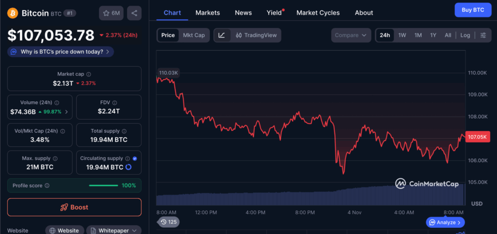 ในขณะที่รายงาน ราคา Bitcoin กำลังซื้อขายอยู่ที่ 107,053 ดอลลาร์ ลดลง 2.37% ภายใน 24 ชั่วโมง อ้างอิงข้อมูลจาก coinmarketcap