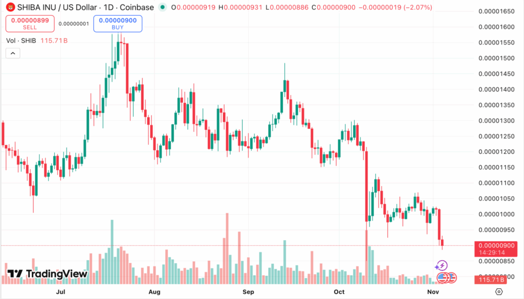 ราคาของ Shiba Inu (SHIB) ร่วงลงอย่างต่อเนื่อง จนตอนนี้แตะระดับต่ำสุด นับตั้งแต่ เดือนมกราคม 2024 อยู่ที่ราว ๆ $0.0000089 ซึ่งถือว่า เป็นแนวโน้มขาลงที่ลากยาวมาเกือบ 9 เดือนเต็ม และราคายังทะลุแนวรับสำคัญระยะสั้นลงมาแล้วด้วย
