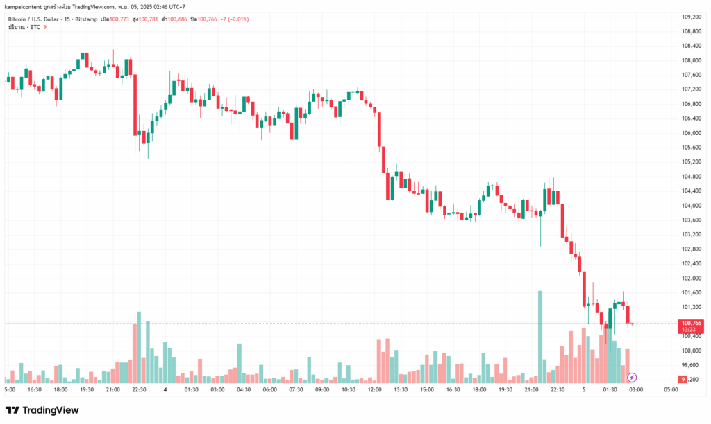 สกุลเงินดิจิทัลอันดับหนึ่งของโลกได้ร่วงลงมากถึง 6.5% แตะระดับ 99,963 ดอลลาร์ ในวันอังคาร ซึ่งเป็นการซื้อขายที่ระดับต่ำกว่า 100,000 ดอลลาร์เป็นครั้งแรกนับตั้งแต่เดือนมิถุนายน ตอนนี้ราคาได้ร่วงลงมากกว่า 20% จากจุดสูงสุดเป็นประวัติการณ์ที่ทำไว้เมื่อเดือนที่แล้ว ขณะที่ Ether (ETH) “เจ็บหนักกว่า” โดยดิ่งลงถึง 9.6% และ Altcoin อื่นๆ ก็ร่วงลงในลักษณะเดียวกัน