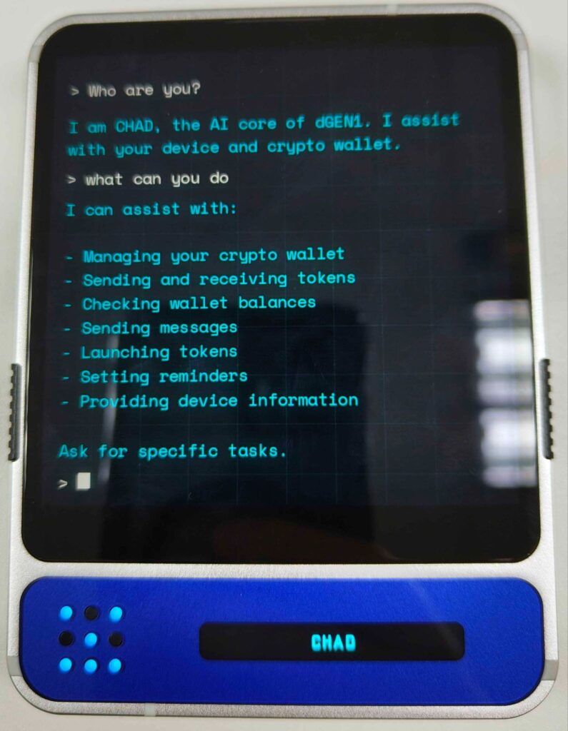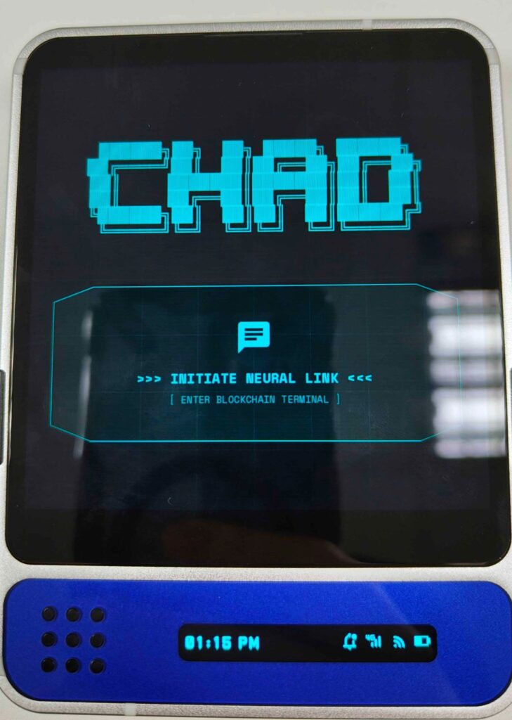 สำหรับแอปพิเศษที่มีการติดตั้งมาให้เริ่มต้นกันด้วย CHAD ซึ่งเป็นเหมือนกับเอไอผู้ช่วยของโทรศัพท์ แต่แทนที่มันจะเน้นในการถามตอบเหมือน ChatGPT ตัวของ CHAD จะมุ่งไปยังการบริหารกระเป๋าเงินของเรามากกว่า ซึ่งมันสามารถออกคำสั่งรับส่ง หรือตรวจสอบยอดเงินคงเหลือ และอื่น ๆ ได้