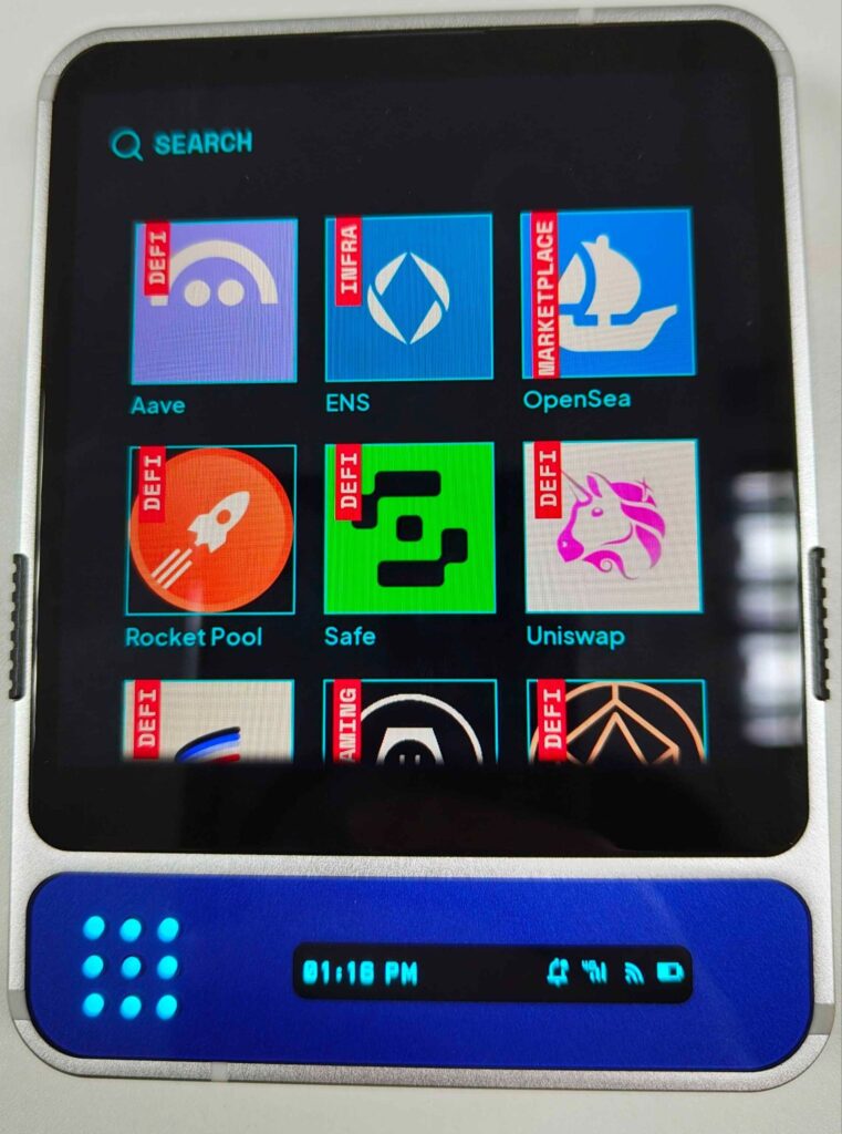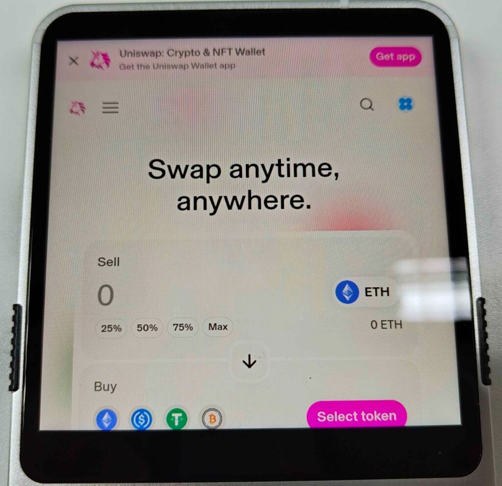 ถัดมาคือ ฟีเจอร์หลักของเครื่องกับจุดขาย “Hardest Hardware Wallet in the World” ซึ่งในแอปก็เหมือนกับกระเป๋าทั่วไปคือมี QR Code รับเงิน มีให้กด Swap ที่จะเปิดหน้าต่าง Uniswap ขึ้นมาให้โดยอัตโนมัติ และฟังก์ชัน Gas ที่เป็นการเติมค่าแก๊ซเข้ากระเป๋าผ่านระบบ Paymaster ที่ทำให้ใช้งานได้ทุกเชนที่รองรับโดยไม่ต้องทำการ Bridge