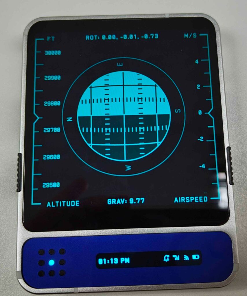 ตอนแรกที่เปิดเครื่องเราจะต้องทำการตั้งค่าและตั้งรหัส ซึ่งเมื่อตั้งเสร็จเราจะไปพบกับหน้าจอล็อกที่เป็น หน้าจอหลักของอุปกรณ์แสดงข้อมูลที่มีลักษณะคล้ายกับ มาตรวัดในห้องนักบินซึ่งประกอบไปด้วย ระดับความสูง ความเร็วลม และ แรงโน้มถ่วง