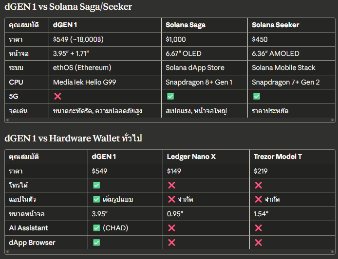 โดยรวมแล้ว  dGEN 1 เป็น Hardware Wallet ที่โทรออกได้ ในขณะที่ Saga/Seeker เป็นสมาร์ตโฟนที่มี Wallet ในตัว