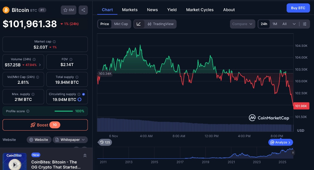ภาพราคา btc/usd วันที่ 6 พฤศจิกายน 2025 จาก coinmarketcap