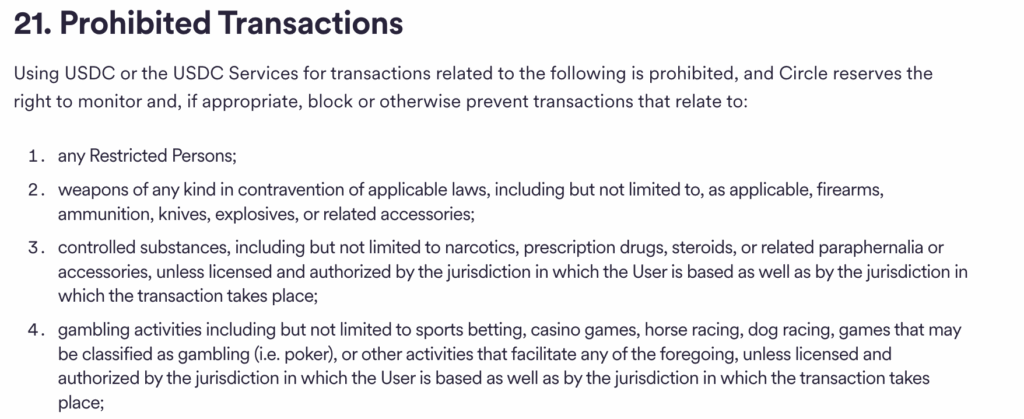 Circle บริษัทแม่ผู้ออกเหรียญ Stablecoin USDC ได้อัปเดตกฏเกณฑ์ข้อตกลงการใช้งานสกุลเงินดังกล่าว เพื่อห้ามการซื้อหรือขายอาวุธ “ที่ขัดต่อกฎหมายที่บังคับใช้” ซึ่งบ่งชี้ว่าธุรกรรมที่ได้รับอนุญาตตามกฎหมายนั้นสามารถทำได้