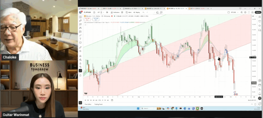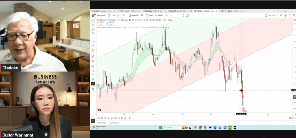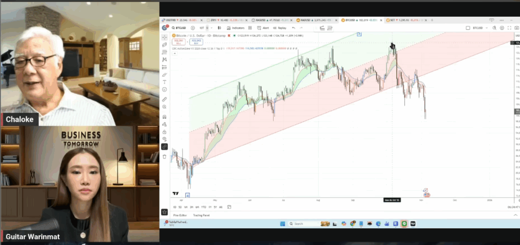 คุณลุงโฉลก สัมพันธารักษ์ นักลงทุนชื่อดังของไทย และผู้ก่อตั้งชมรม CDC Chaloke.com ได้ร่วมพูดคุยในรายการ Business tomorrow เมื่อวันที่ 5 พฤศจิกายน ที่ผ่านมา ในหัวข้อ “วิเคราะห์สด! ฟองสบู่เริ่มแตก? จบรอบ บิทคอยน์-ทองคำ” โดยแสดงมุมมองเชิงลึกเกี่ยวกับทิศทางของราคา Bitcoin ผ่านการดูกราฟวิเคราะห์ทางเทคนิค
