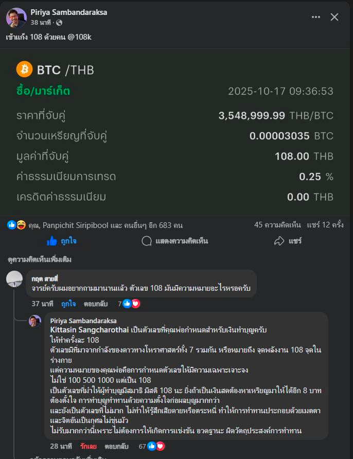 แต่สิ่งที่คนสงสัยกันหนักมากก็คือ “ทำไมต้อง 108 บาท?” ตัวเลขแปลก ๆ  ไม่สื่อถึงกราฟ ไม่เกี่ยวกับเทคนิคคริปโต แล้วทำไมอาจารย์ตั๊มถึงยึดเลขนี้เป็นหลัก