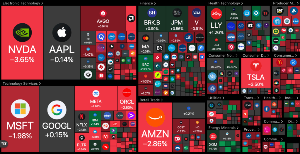สินทรัพย์เสี่ยงร่วงลงพร้อมกัน ทั้ง S&P 500 ที่ร่วงลงไป 1.3% และ Nasdaq 100 ที่ดำดิ่งไปกว่า 2% แม้แต่หุ้นเทคฯ ตัวพ่ออย่าง NVIDIA และ Tesla (TSLA) ก็ร่วงไปกว่า 3.5% ส่วนตลาดคริปโตฯ ก็เละไม่แพ้กัน Bitcoin ดิ่งแรงสุดถึง 2.5% ราคาหลุดจาก $103,872 ไปเหลือแค่ $101,325 ทำให้หุ้นคริปโตฯ ก็กอดคอดิ่งเหว ทั้ง MicroStrategy (MSTR) และ Coinbase (COIN) ที่ร่วงไปกว่า 7% ส่วน Circle (CRCL) นี่หนักสุด ทิ้งดิ่งไปถึง 11%