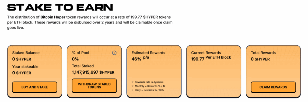 HYPER ยังทำหน้าที่เป็นสกุลเงินสำหรับการ staking ของโปรเจกต์ โดยโปรโตคอลการstaking ดั้งเดิมในปัจจุบันเสนออัตรา APY แบบไดนามิกที่ 46% เพื่อให้ได้รับประสบการณ์ที่ราบรื่นที่สุด
