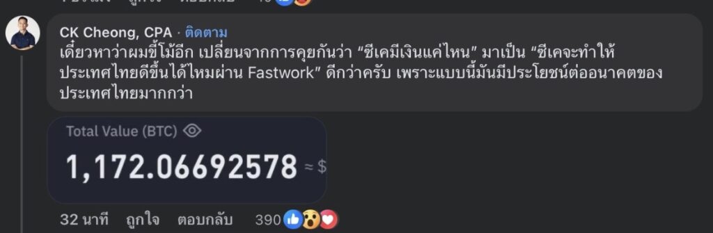 กลายเป็นกระแสฮือฮาทั่ววงการคริปโตไทย หลังจากคุณ CK Cheong CEO ของแพลตฟอร์มฟรีแลนซ์ชื่อดัง Fastwork ออกมาเผยกลางเวที Thailand Blockchain Week 2025 ว่าเขาถือ Bitcoin มากกว่า 1,000 BTC ที่สะสมมาตั้งแต่ยุคแรก ๆ ของตลาดคริปโต โดยได้กล่าวบนเวทีว่า
