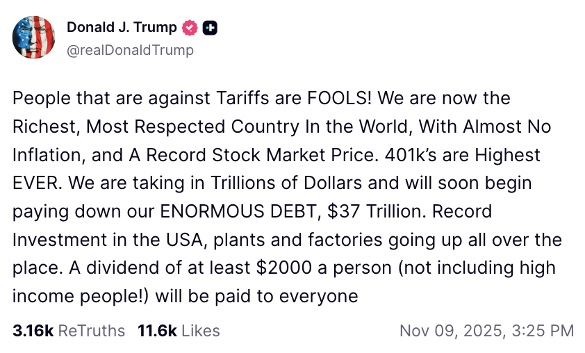 เหตุการณ์ดังกล่าวก็ดูมีเค้าลางว่ากำลังจะซ้ำรอยเมื่อทรัมป์ได้เผยว่าเขาอาจจะมีการแจกเงินปันผลให้กับประชาชนคนละ $2,000 ซึ่งเป็นเงินที่ได้จากการเก็บภาษีนำเข้ามาแจกจ่าย แต่รายละเอียดเพิ่มเติมยังคงไม่ถูกเปิดเผยว่าจะสามารถอนุมัติได้จริงหรือไม่