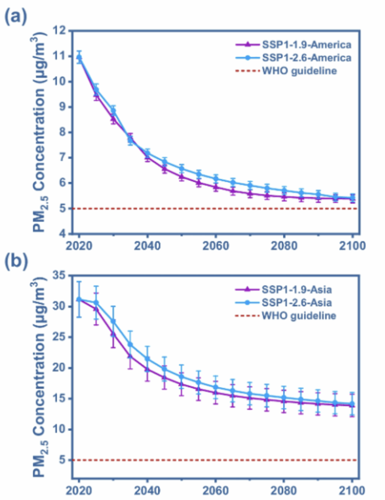ซึ่งการคาดการณ์นี้แสดงให้เห็นว่า แม้จะมีการลดการปล่อยก๊าซเรือนกระจก PM 2.5 ก็ยังคงมีระดับสูงเกินกว่าคำแนะนำขององค์การอนามัยโลก (WHO) หากไม่มีการควบคุมการปล่อยจากแหล่งธรรมชาติอย่างเช่น การเผาไหม้ทางชีวภาพ และฝุ่นที่เกิดขึ้นจากดิน