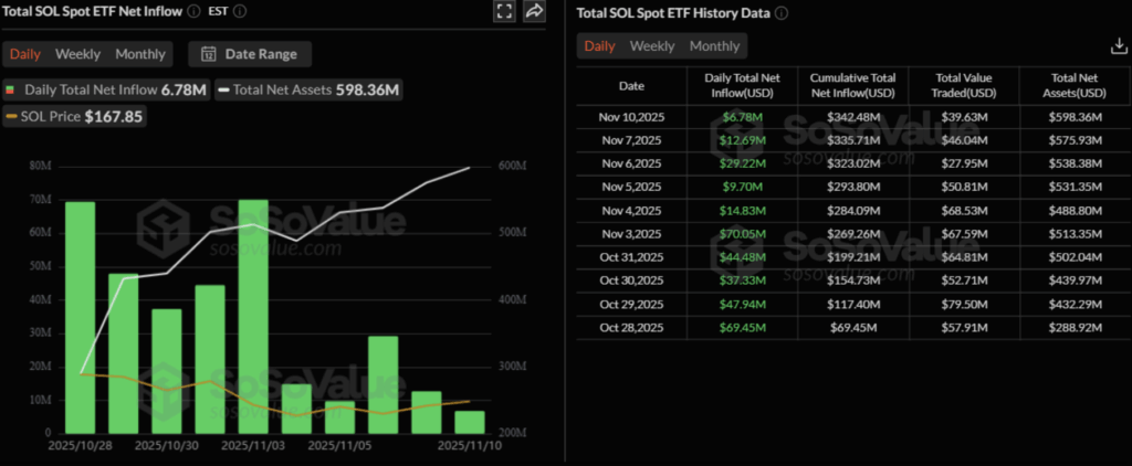 กองทุน Solana ETF ที่จดทะเบียนในสหรัฐฯ สามารถดึงดูดเงินไหลเข้าสุทธิอย่างต่อเนื่อง 10 วันติดต่อกัน โดยเมื่อวันที่ 10 พฤศจิกายน มีเงินไหลเข้าใหม่ 6.78 ล้านดอลลาร์