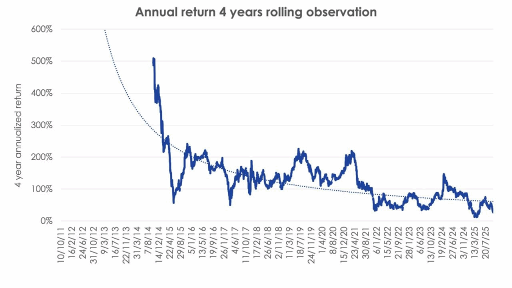 แม้ว่าราคา Bitcoin จะยังคงปรับตัวเพิ่มขึ้นอย่างน่าประทับใจ เช่น จาก $15,000 ดอลลาร์ ไปแตะ $126,000 ดอลลาร์ ในจุดสูงสุดล่าสุด แต่การวิเคราะห์ผลตอบแทนเฉลี่ยในรอบ 4 ปี ก็พบแนวโน้มที่ชัดเจนว่า “ผลตอบแทนลดลงตามเวลา” ซึ่งสมเหตุสมผลเพราะการเพิ่มมูลค่าจาก $2 ล้านล้านดอลลาร์ไปเป็น $4 ล้านล้านดอลลาร์นั้นยากกว่าตอนที่มูลค่าตลาดยังน้อยมาก