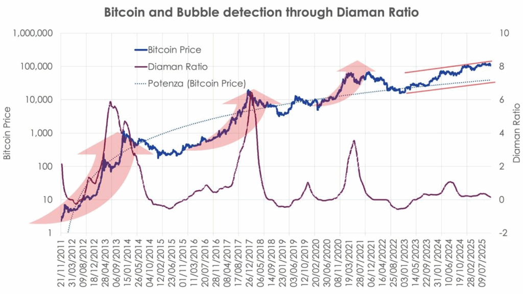 ในปี 2011 นักวิเคราะห์ได้ใช้เครื่องมือที่เรียกว่า “Diaman Ratio (DR)” ที่พัฒนาโดย Diaman Partners เพื่อประเมินว่าราคาสินทรัพย์กำลังอยู่ในช่วงฟองสบู่หรือไม่ โดยมีเกณฑ์คือ ถ้า DR ทะลุ 1 (DR > 1) จะถือว่าการเติบโตเกินระดับเอ็กซ์โปเนนเชียลและเข้าข่าย “ฟองสบู่” ทันที