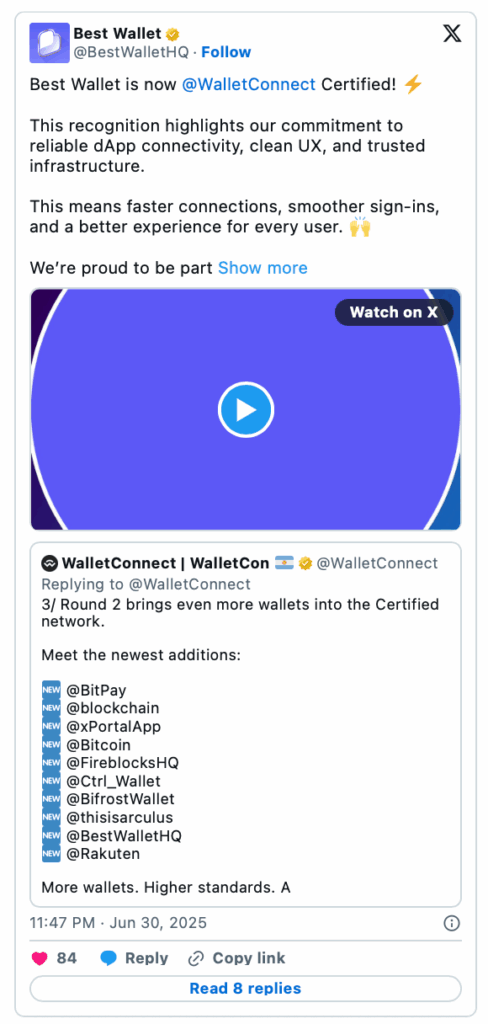 การที่ได้รับการรับรอง WalletConnect หมายความว่า Best Wallet ผ่านการทดสอบอย่างเข้มงวด ในด้านการเชื่อมต่อที่ปลอดภัยและเชื่อถือได้ ทำให้ผู้ใช้งานสามารถสื่อสารและเชื่อมต่อกับ แอปพลิเคชันแบบกระจายศูนย์ (dApps) หลายพันรายการบนเครือข่ายหลัก เช่น Ethereum, BNB Chain, Polygon และเครือข่ายอื่น ๆ ได้อย่างราบรื่น