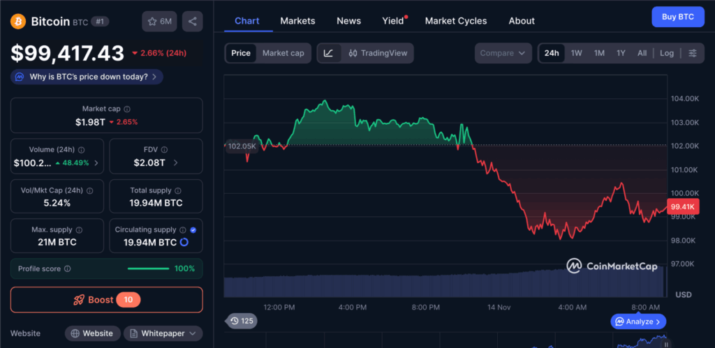 ในขณะที่รายงาน ราคา Bitcoin กำลังซื้อขายอยู่ที่ 99,417 ดอลลาร์ ลดลง 2.66% ภายใน 24 ชั่วโมง อ้างอิงข้อมูลจาก coinmarketcap