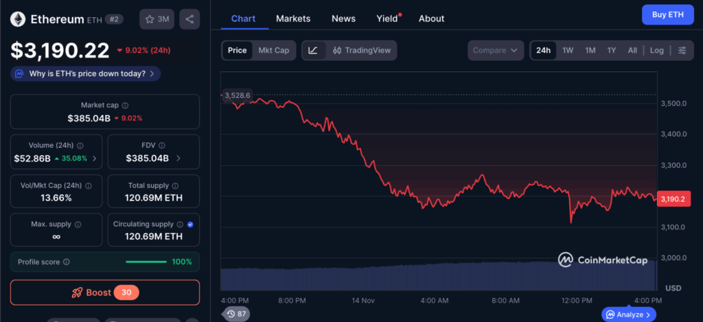 ในขณะที่รายงาน ราคา Ethereum กำลังซื้อขายอยู่ที่ 3,190 ดอลลาร์ ลดลง 9.02% ภายใน 24 ชั่วโมง อ้างอิงข้อมูลจาก coinmarketcap.