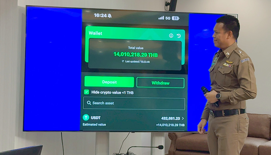เจ้าหน้าที่ตำรวจไซเบอร์ไทยแสดง digital wallet (กระเป๋าเงินดิจิทัล) ที่มียอดคริปโตเคอร์เรนซีมูลค่ากว่า 14 ล้านบาท ($432,000) ที่ยึดคืนมาได้ ระหว่างการแถลงข่าวในกรุงเทพฯ หลังปฏิบัติการร่วมกับ FBI ในการยึดทรัพย์สินจากแฮกเกอร์ชาวยุโรป
