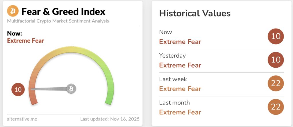 แรงเทขายในช่วงนี้ยังสอดคล้องกับบรรยากาศความกังวลของตลาด โดย Bitcoin Fear & Greed Index ร่วงลงสู่ระดับ 10 ซึ่งถือเป็นโซน “Extreme Fear” หรือภาวะกลัวสุดขีดอย่างเป็นทางการ