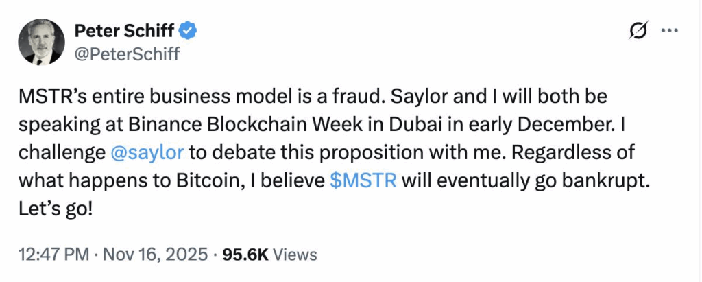 เมื่อวานนี้ (16 พ.ย.) นักลงทุนทองคำชื่อดัง Peter Schiff ออกมาโจมตีโมเดลธุรกิจของ Strategy บริษัทที่ถือครองบิทคอยน์มากที่สุดในโลกว่าเป็น “พวกลวงโลก” พร้อมท้าชนตัวผู้ก่อตั้งอย่าง Michael Saylor ดีเบตตัวต่อตัวในงาน Binance Blockchain Week ที่ดูไบเดือนธันวาคม 2025
